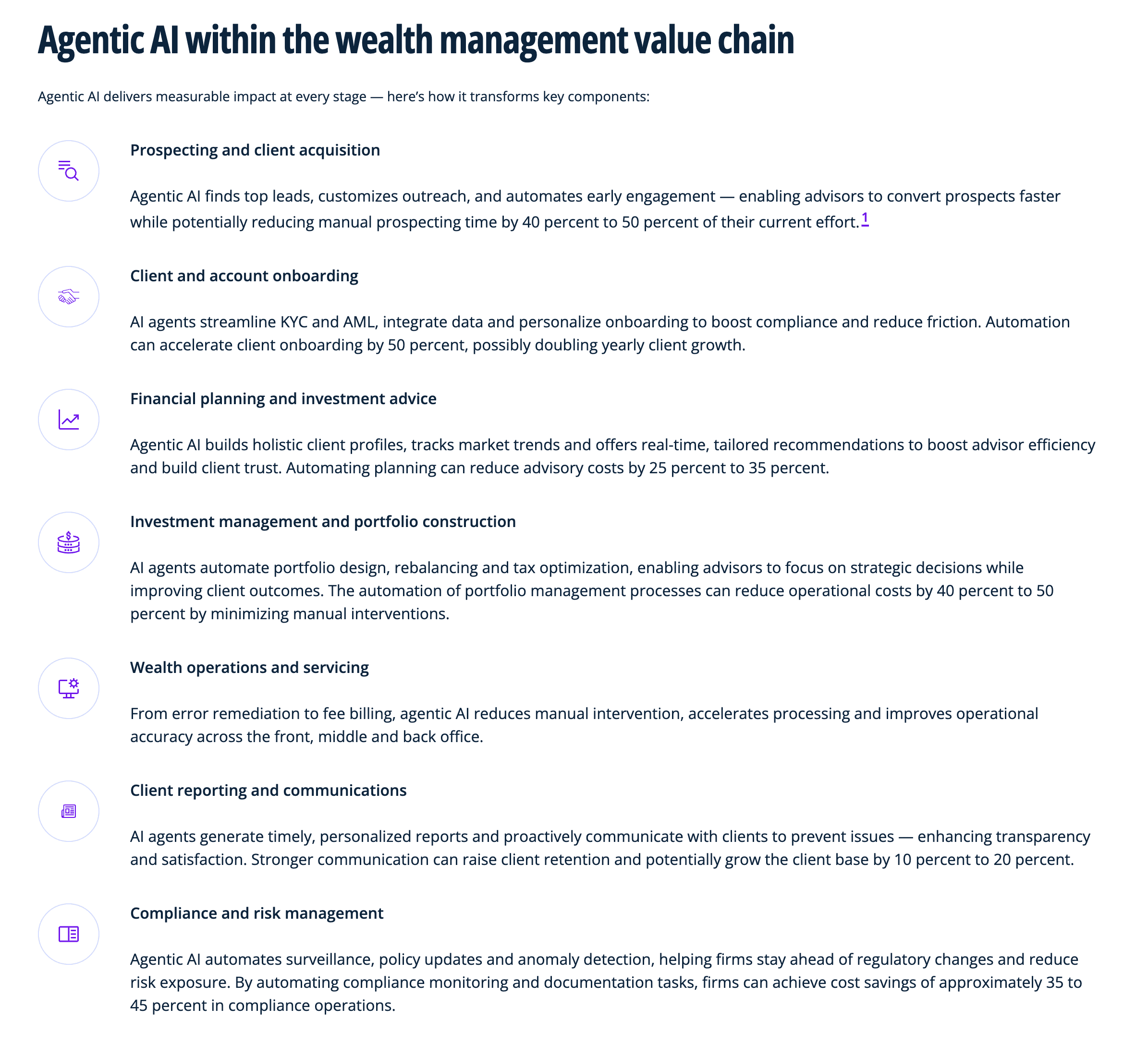 KPMG's case study with a top-10 investment manager demonstrates real-world results: their agentic AI assistant analyzes advisor profiles and meeting notes to generate personalized agendas, saving 20,000 hours annually.