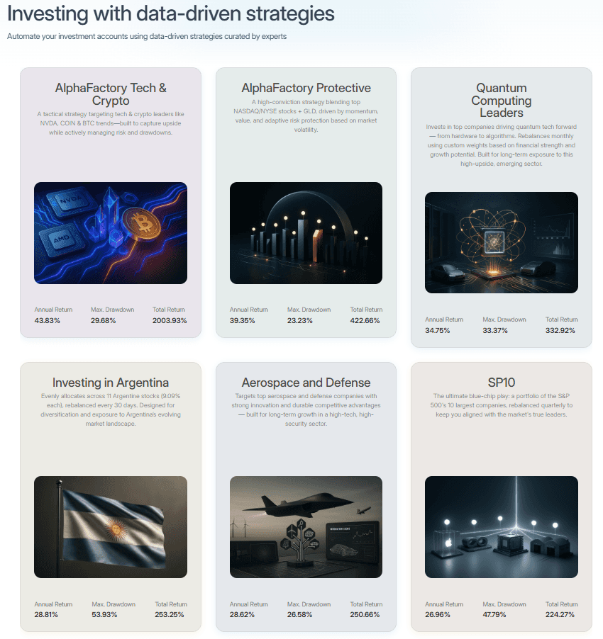 Automate any portfolio using data-driven strategies made by top creators & professional investors. Turn any investment idea into an automated, testable, and sharable strategy.