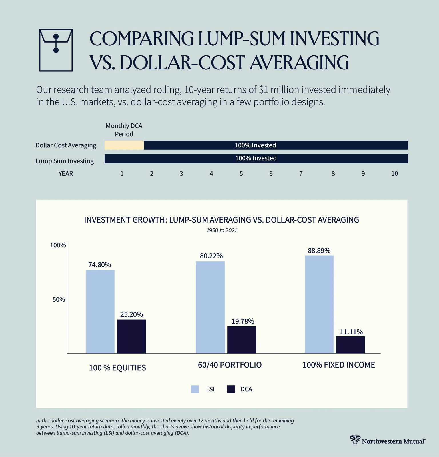 Northwestern Mutual's January 2025 analysis of rolling 10-year returns found that lump sum investing outperformed DCA 75% of the time when invested entirely in stocks. For a 60/40 stock-bond portfolio, that number jumped to 80%. The data is clear: trading mathematical performance for emotional comfort is an expensive tradeoff.