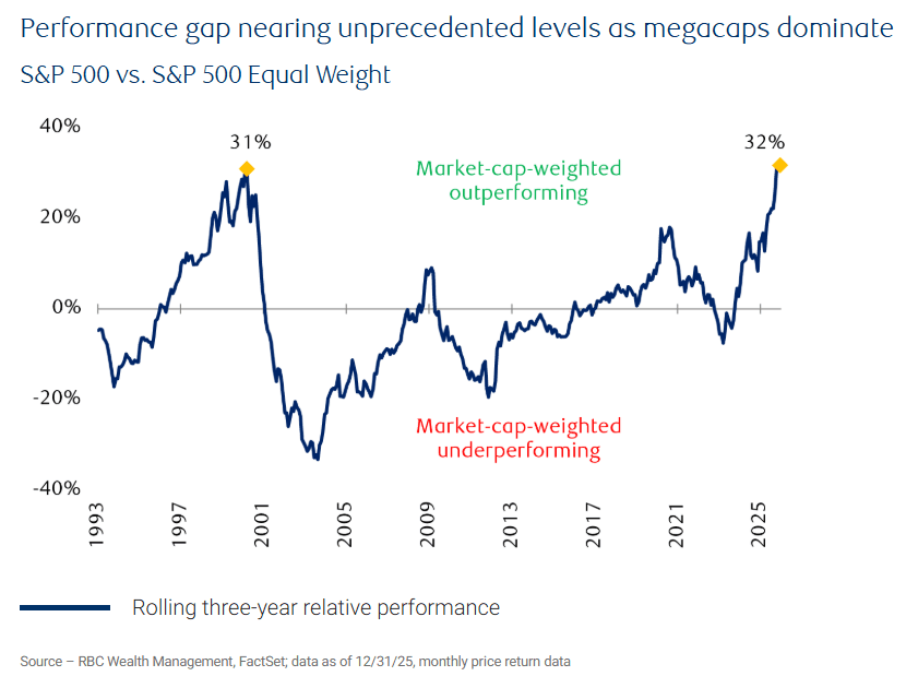 RBC Wealth Management recently pointed out that, at the beginning of this year, the 10 largest companies in the S&P 500 accounted for nearly 41% of the index’s total weight.
