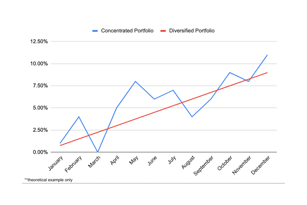 Standard deviation only tells part of the story. Research in the Journal of Portfolio Management shows concentrated portfolios experience drawdowns 40-60% deeper than diversified peers during market stress.