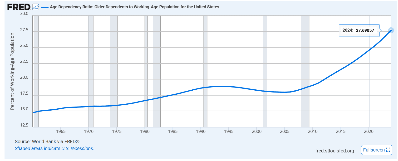 An aging population, for example, means more retirees relying on pensions and healthcare systems, while the working-age population shrinks. This raises the dependency ratio—the number of people drawing benefits versus those contributing—and creates pressure on governments to fund social programs. According to data from the World Bank, the United States’ dependency ratio is currently ~28, which means that there are around 28 people, over the age of 64, that are being supported by every 100 individuals belonging to the working age population, between 15 and 63. This trend has picked up since 2008, and is expected to continue climbing.