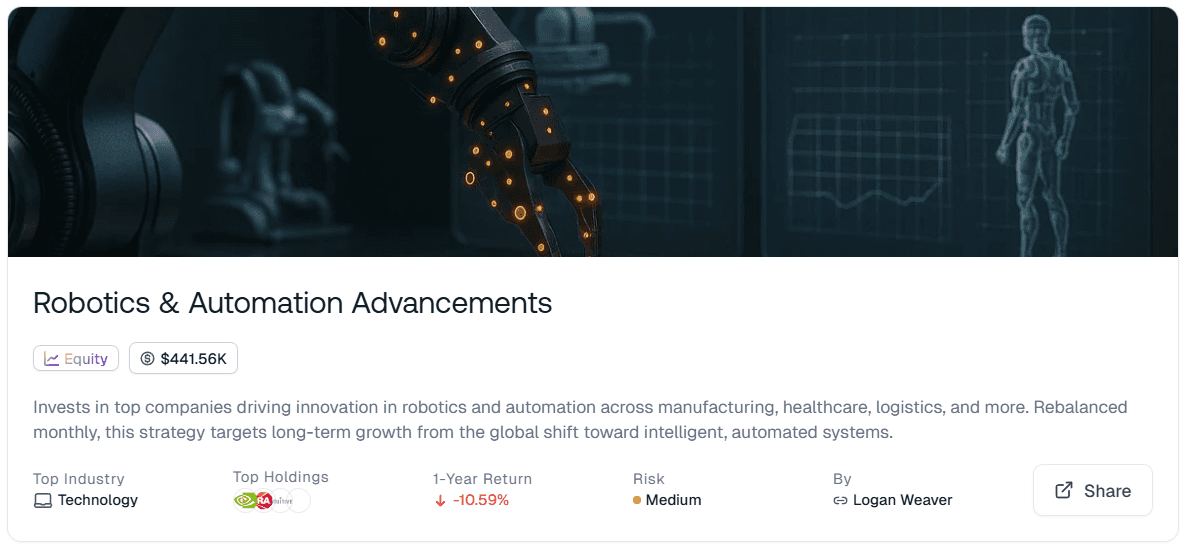 Automate any portfolio using data-driven strategies made by top creators & professional investors. Turn any investment idea into an automated, testable, and sharable strategy.
