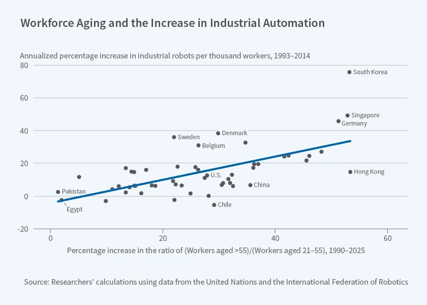 As demographic headwinds intensify and labor markets tighten, one of the spaces that really stands out as one of the most logical long term investment themes of the coming decades is that of robotics. According to a study by the National Bureau of Economic Research, there is a clear correlation between a growing proportion of an aging population and robotics industrialization: