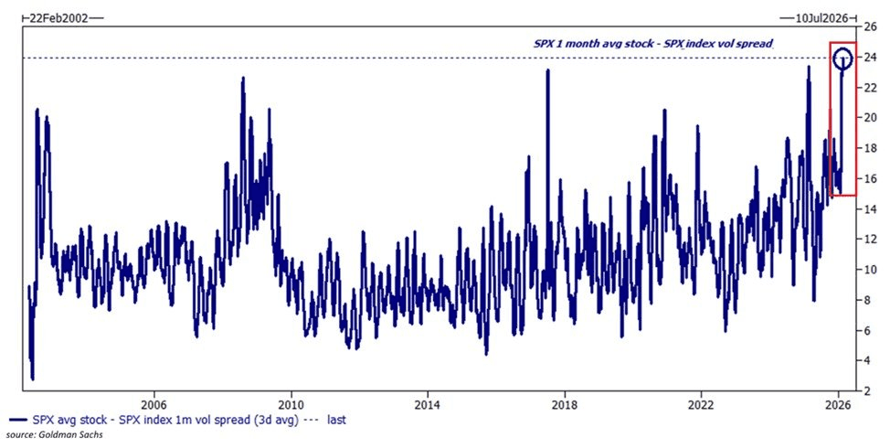 Data from Goldman Sachs actually points out that the 1-month realized volatility of the average S&P 500 stock relative to the index itself has climbed to 24 points—the highest on record. This tells us that while the "S&P 500" as a single entity seems stable, the individual companies inside it are swinging wildly.