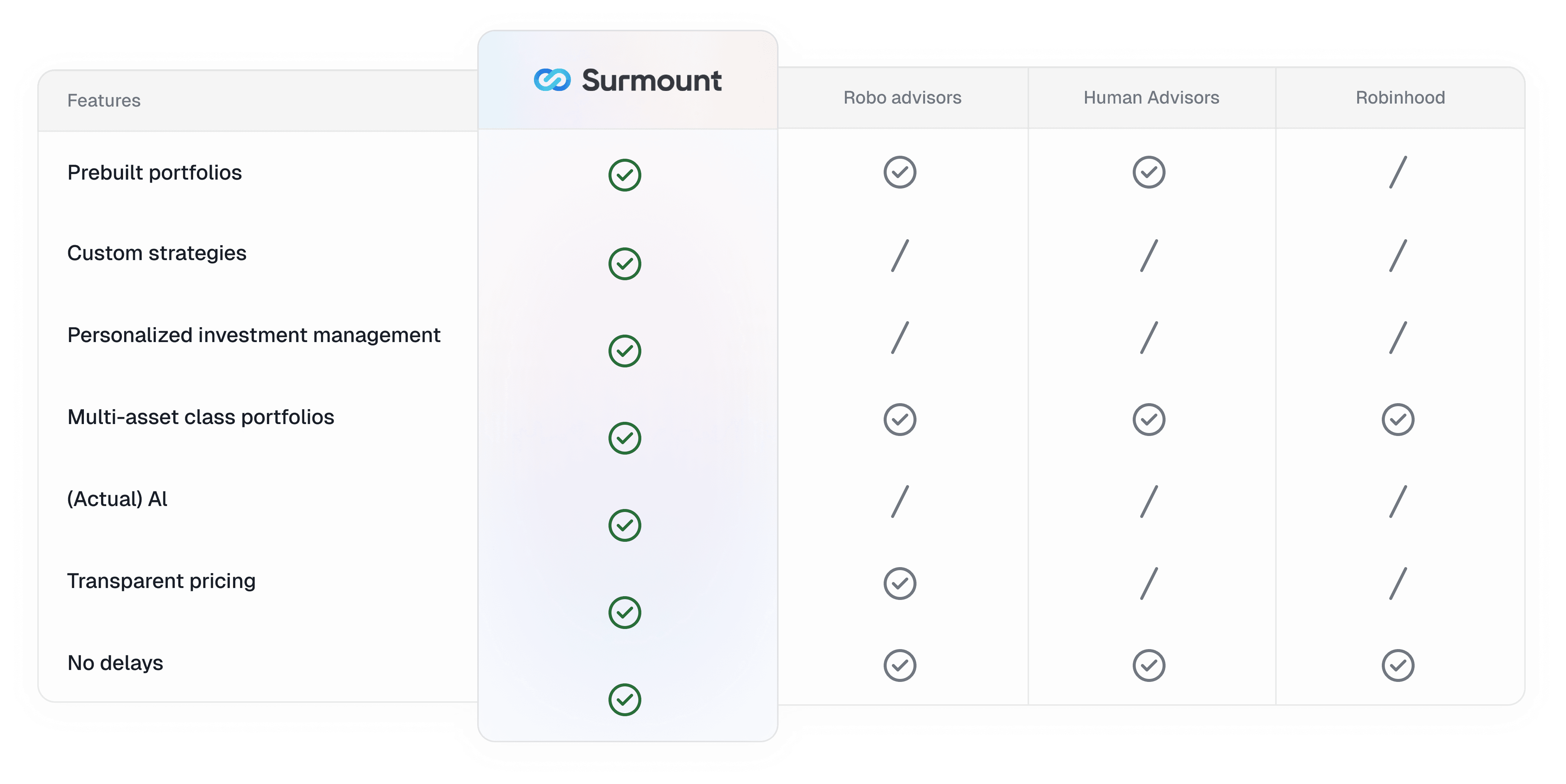 Surmount automates your investing, from building portfolios to executing trades while managing risk and taxes in real time for effortless growth.