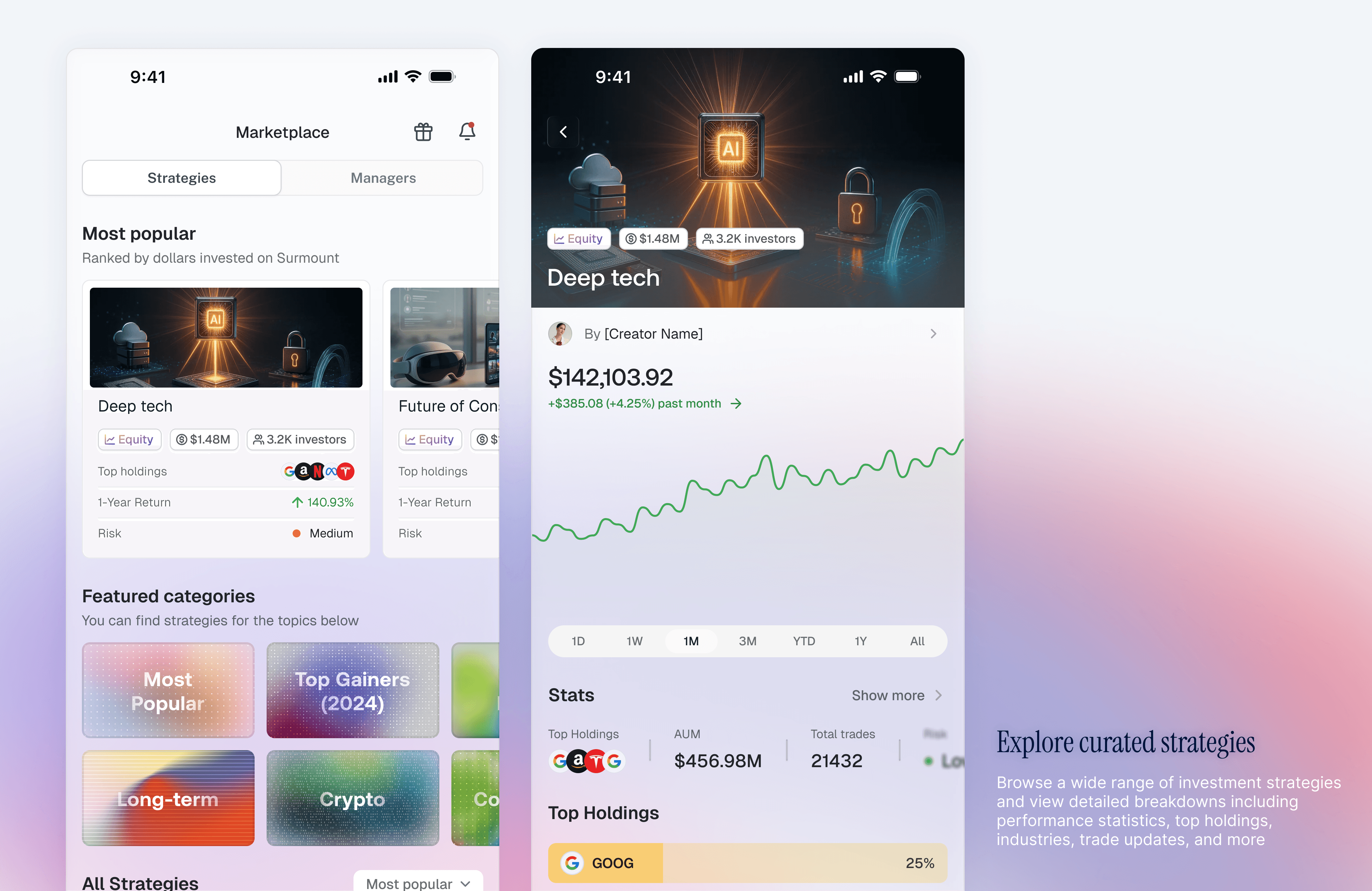 Explore detailed strategy insights and invest directly from the app with a smooth and guided experience.