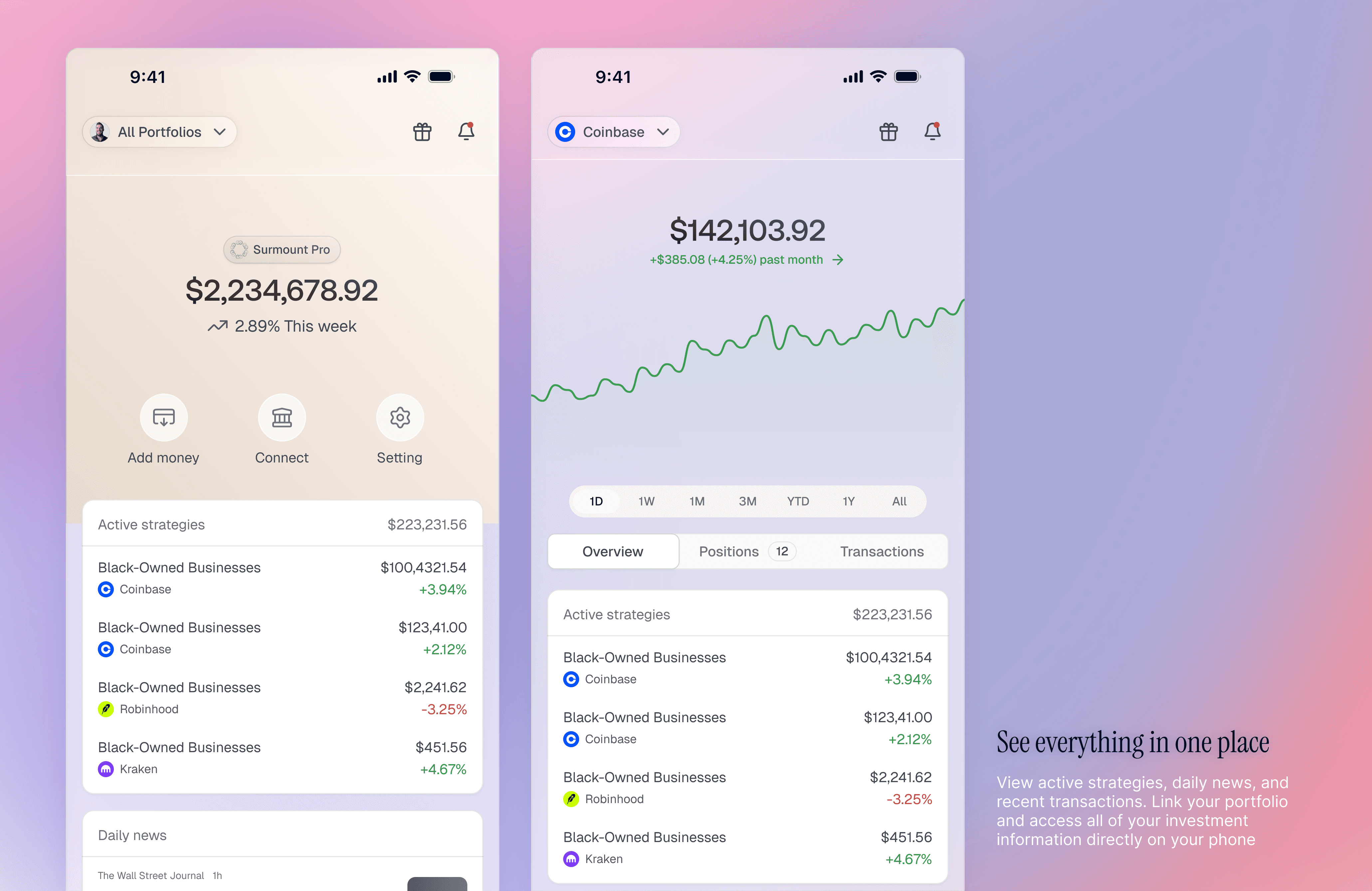 View active strategies, news, positions, and transactions in one clear and powerful dashboard.